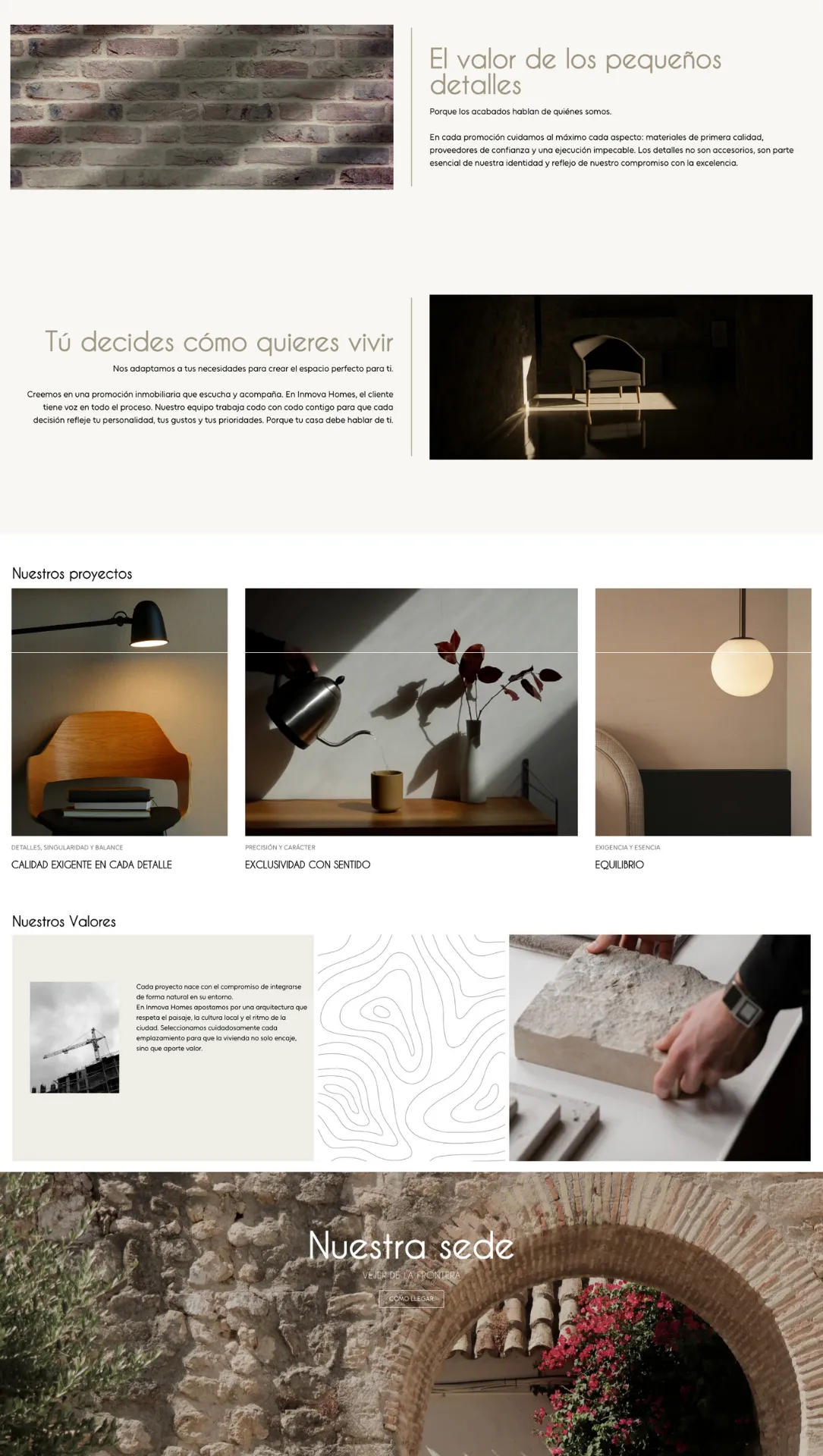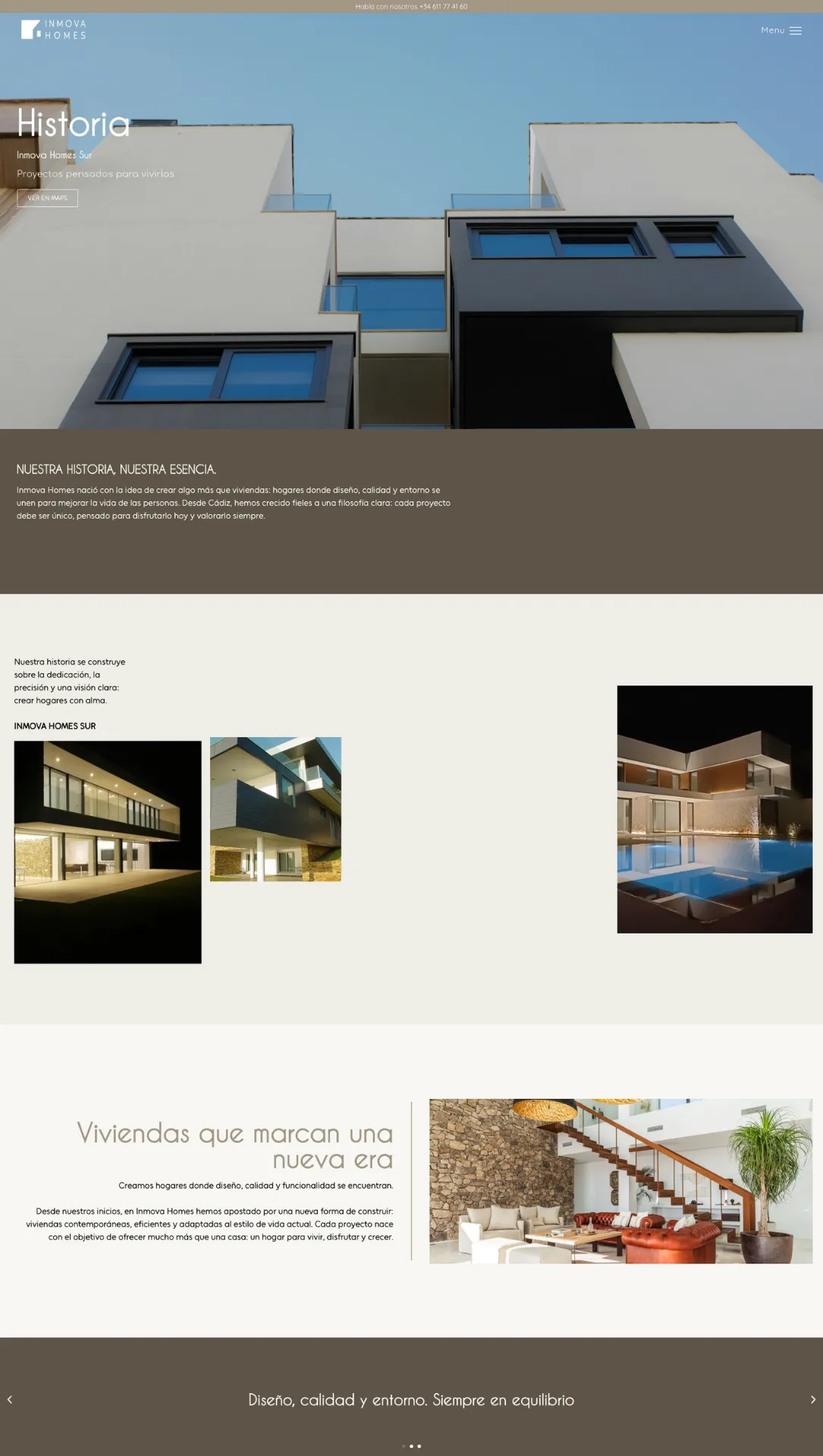 El diseño no busca llamar la atención, busca la armonía visual. Espacios amplios, ritmo visual pausado y una jerarquía clara que permite entender proyectos complejos sin esfuerzo. Una web que no vende a gritos, pero que posiciona a Inmova Homes exactamente donde debe estar: en el segmento alto del mercado.