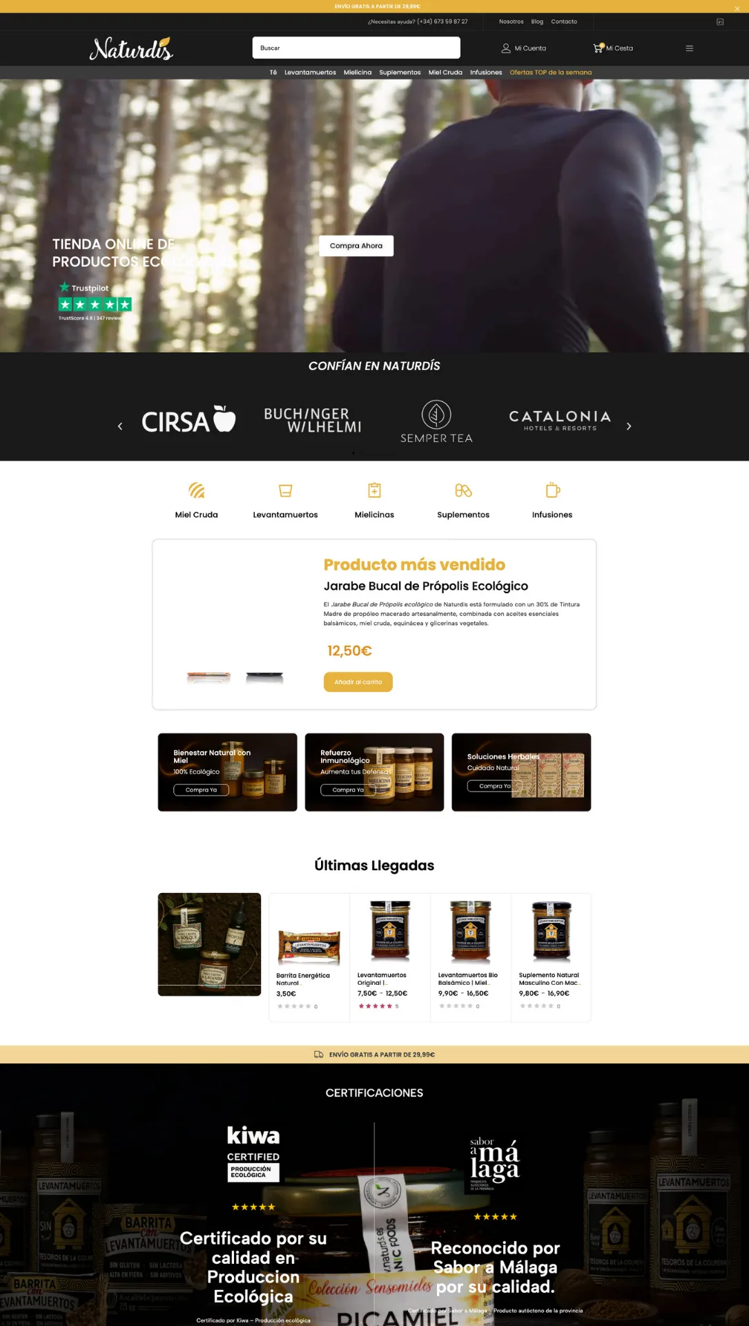 Naturdis contaba con un catálogo excepcional de mieles ecológicas y productos gourmet seleccionados con mimo, pero su tienda online no reflejaba el valor real de la marca. A pesar de tener un gran producto y presencia muy fuerte en el mundo B2B, la web apenas generaba ventas y la experiencia de usuario resultaba confusa y poco atractiva.